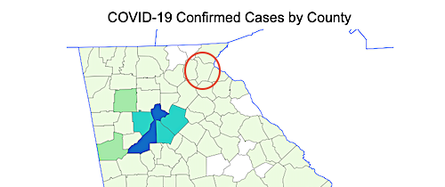 There now are fewer than two dozen counties in Georgia that are still white on the map, indicating they have no confirmed cases of COVID-19. Three of those counties are in Northeast Georgia. They are Elbert, Towns, and Union.