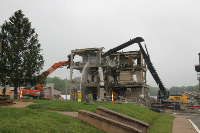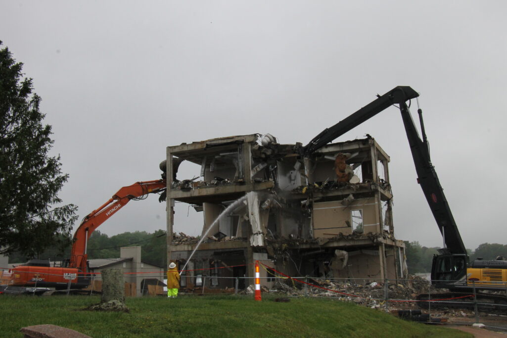 On Tuesday, April 29, work crews were observed actively wetting the structure to suppress dust – a practice maintained even during rainfall – as heavy equipment tore through the building’s remains.