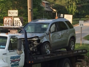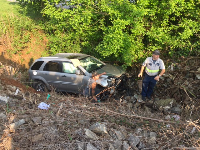 22-year-old Jessica Craven escaped serious injury when the 2008 Chevy Equinox she was driving veered off the road into a deep culvert just past the Mountain Judicial Circuit Public Defender’s Office on Historic Highway 441.