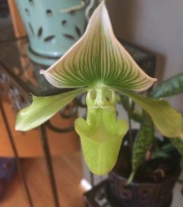 Another orchid that gets her really excited when in bloom is the paphiopedilums or Lady’s Slipper orchid. These are very unique but easy to grow. The requirements are pretty simple. They need to be watered a couple of