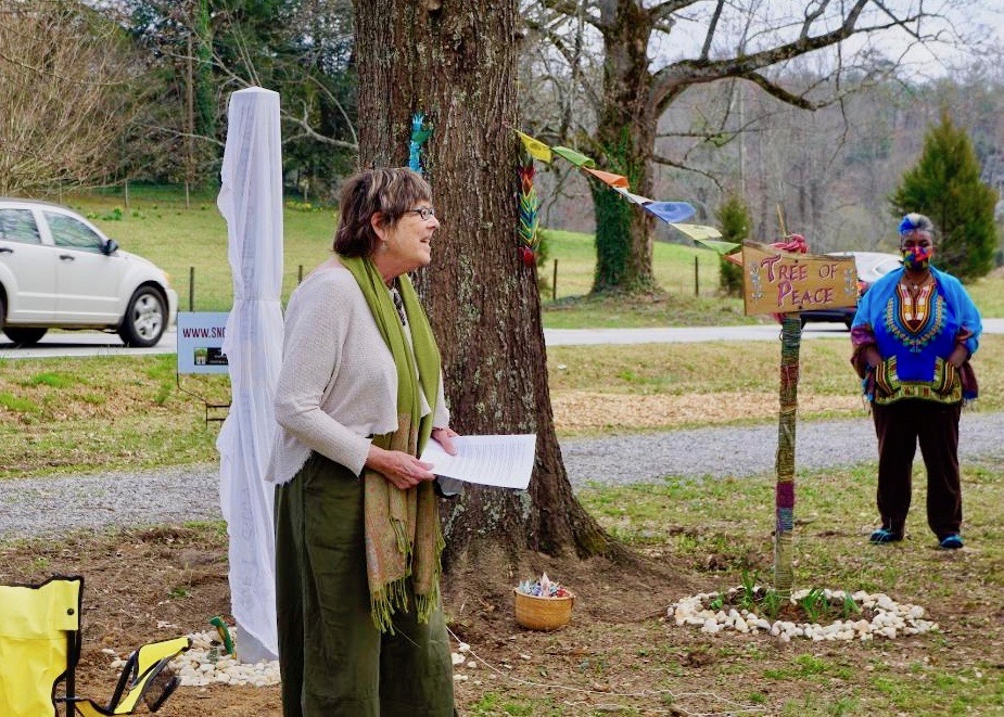 Besides the peace pole, the Tree of Peace was planted on the SCNN grounds in 1988. Brennan shares that the tree was planted at a ceremony led by Mohawk Peace Chief Jake Swamp at the invitation of 5th grade students at White County Elementary School. Sadly, the tree died in 1991, and, at Chief Swamp’s suggestion, another tree was planted to symbolize “burying weapons and arbitrating conflicts, and living by the Great Law of Peace.”