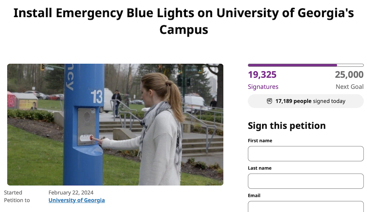 Thousands of students and parents have signed a petition demanding that the University of Georgia install emergency blue lights on campus following the murder of Laken Riley.