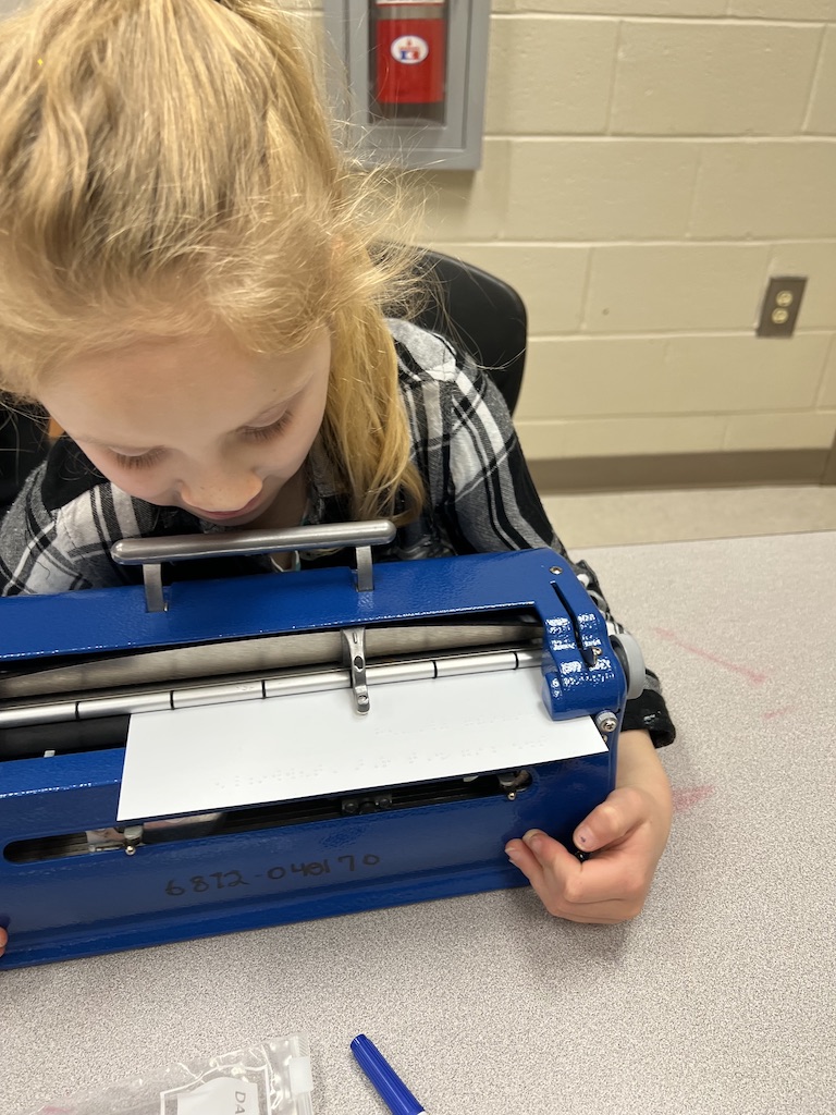 Phoebe works daily at school with Dr. Robin Skelton, who serves as the Teacher for Blindness and Vision Impairment for Habersham County Schools. Dr. Skelton says, “Braille is actually taught in two ways. The first is uncontracted, meaning the learning reads by identifying one letter at a time. The second is contracted, which is more difficult because it requires learning a set of symbols that represent words.” Phoebe can now read in braille and read normally in class. Dr. Skelton shares that Phoebe has learned enough braille now to be considered multi-lingual.