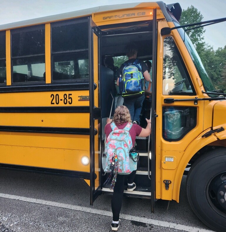 Sarah Spalding posted this photo. Sarah said, “The first day went great! This is Willow (11th grade), Toby (8th grade), and Dorian (5th grade) with the best bus driver Mr. Ron Jones!”