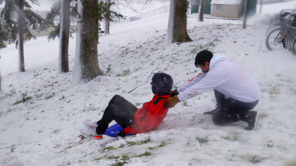 Piedmont students went sledding down the hill outside of Purcell Hall, enjoying the wintery weather on their long weekend. (Hadley Cottingham/Now Habersham)