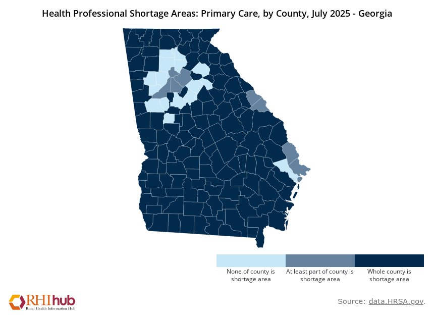 Almost every one of the 95 counties in the state outside of Metro Atlanta, Savannah, and Augusta faces critical shortages of family physicians, nurses, and pharmacists.