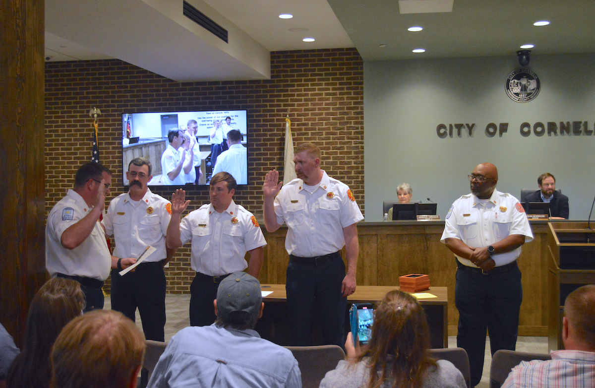 The Cornelia City Commission hosted a firefighter pinning ceremony at its March 7 meeting, during which six firefighters were recognized for their recent promotions. More than 50 people attended, including fire department staff, family, friends, and community members.