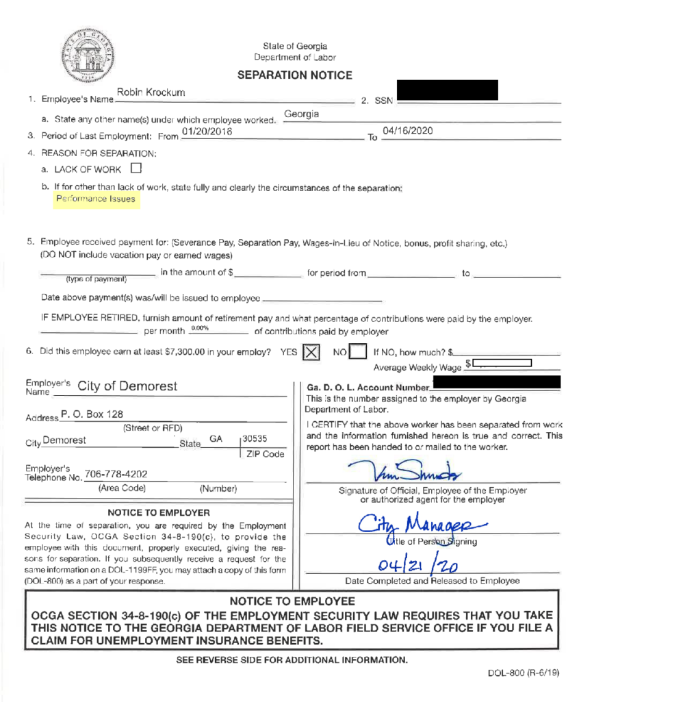 Robin Krockum, who provided a copy of that notice to Now Habersham, says prior to his termination, he was not written-up once in his nearly four-and-a-half years on the job. Under his leadership, the Demorest Police Department was named the number one small police department in the state three years running. Still, according to the notice Simonds signed and sent on April 21, he was fired for “performance issues.”