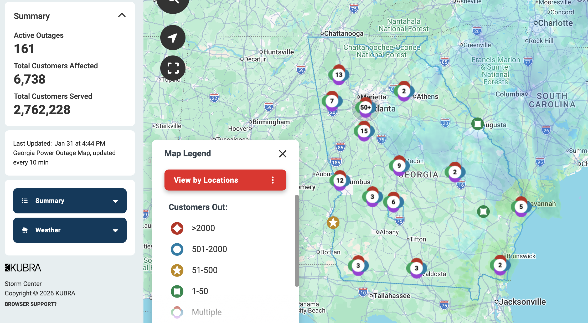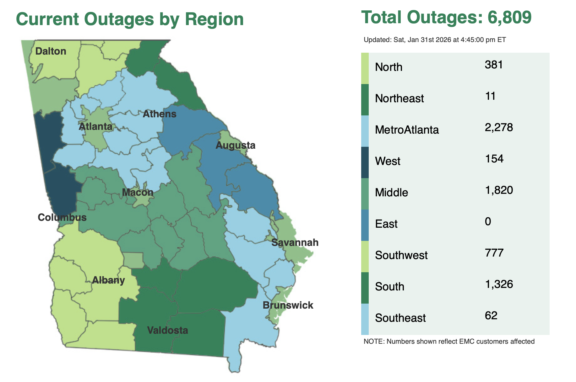 Georgia Power reported some 6,700 customers without electricity and Georgia EMC reported 6,800 as of 4:45 p.m. on Jan. 31.