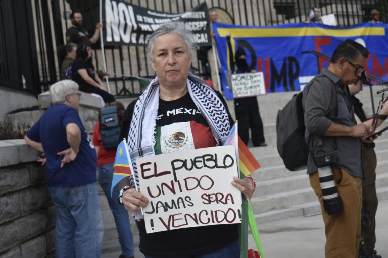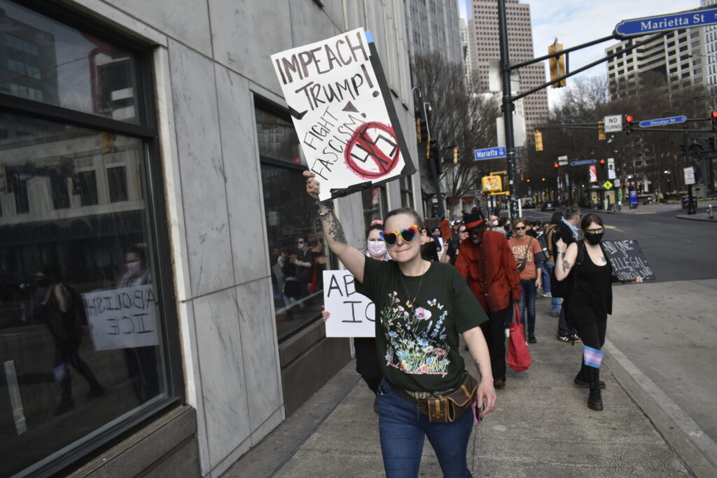 As the sun went down, the focus shifted to immigration as a slightly smaller group led by the Party for Socialism and Liberation marched from the Capitol to ICE’s Atlanta field office bearing signs written in English and Spanish.