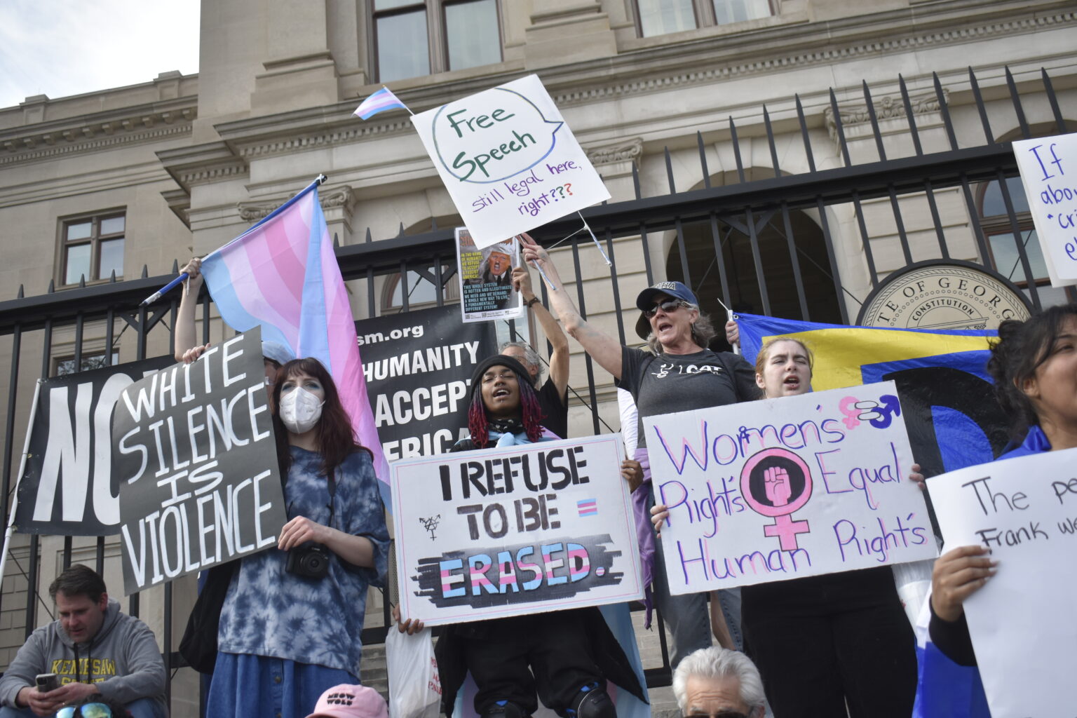 Several hundred people gathered in Centennial Olympic Park bearing signs expressing outrage for a wide range of policies, especially restrictions on transgender Americans, the mass deportation of undocumented immigrants, support for Israel’s war in Gaza and the U.S. Supreme Court’s overturning of Roe v. Wade in 2022.