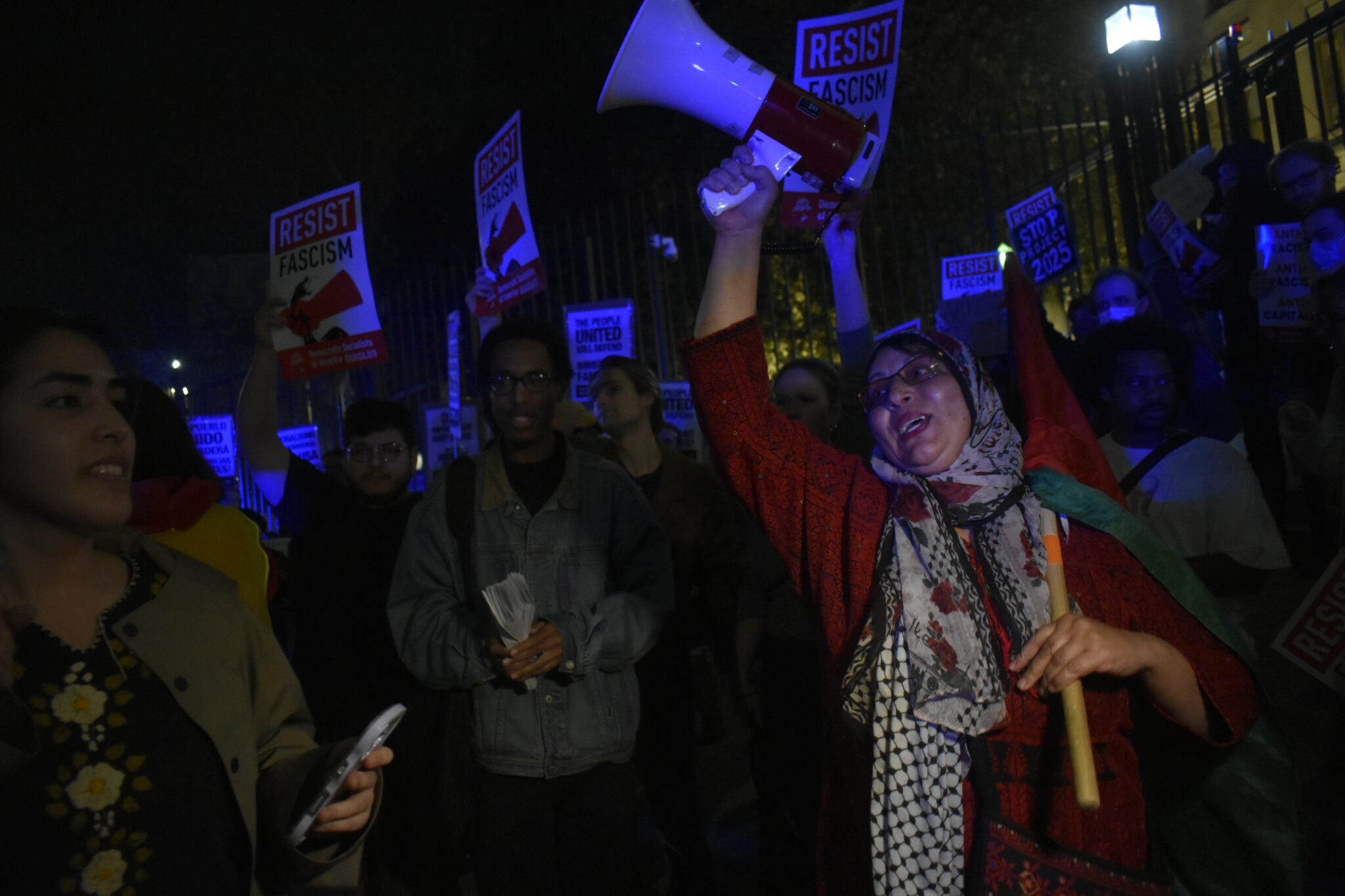 “We’re not scared. We’re not going to back down from this,” she said. “He can do all the policies he wants, but it’s not going to be any difference to us. It’s the same thing. We’re not going to stop fighting here for immigrants, for people of color, of gender, of race. We’re not going to stop. The way we did it for the Palestinians for 17 months, right now, it’s all over the world.”