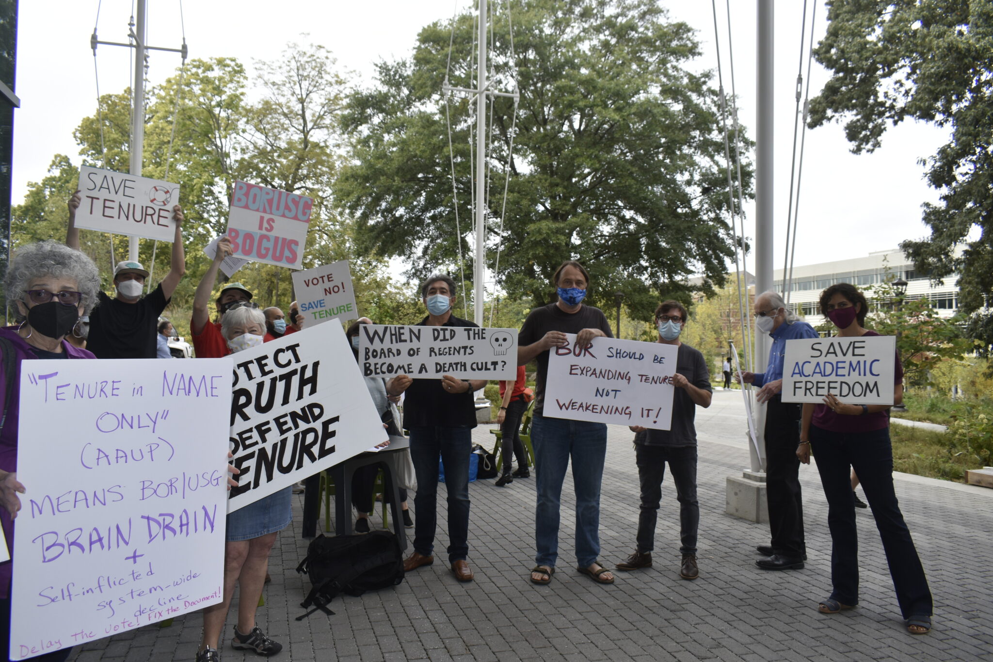 About 50 professors and allies waving signs protested outside the meeting, which was held on the Georgia Tech campus in Atlanta, said they want the regents to leave the state’s tenure system alone.