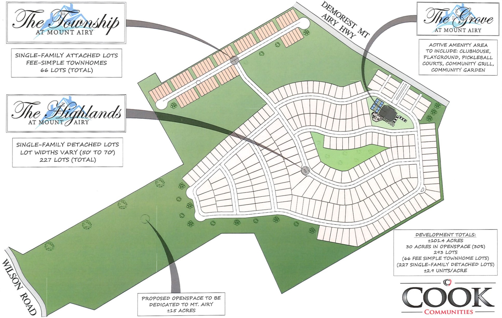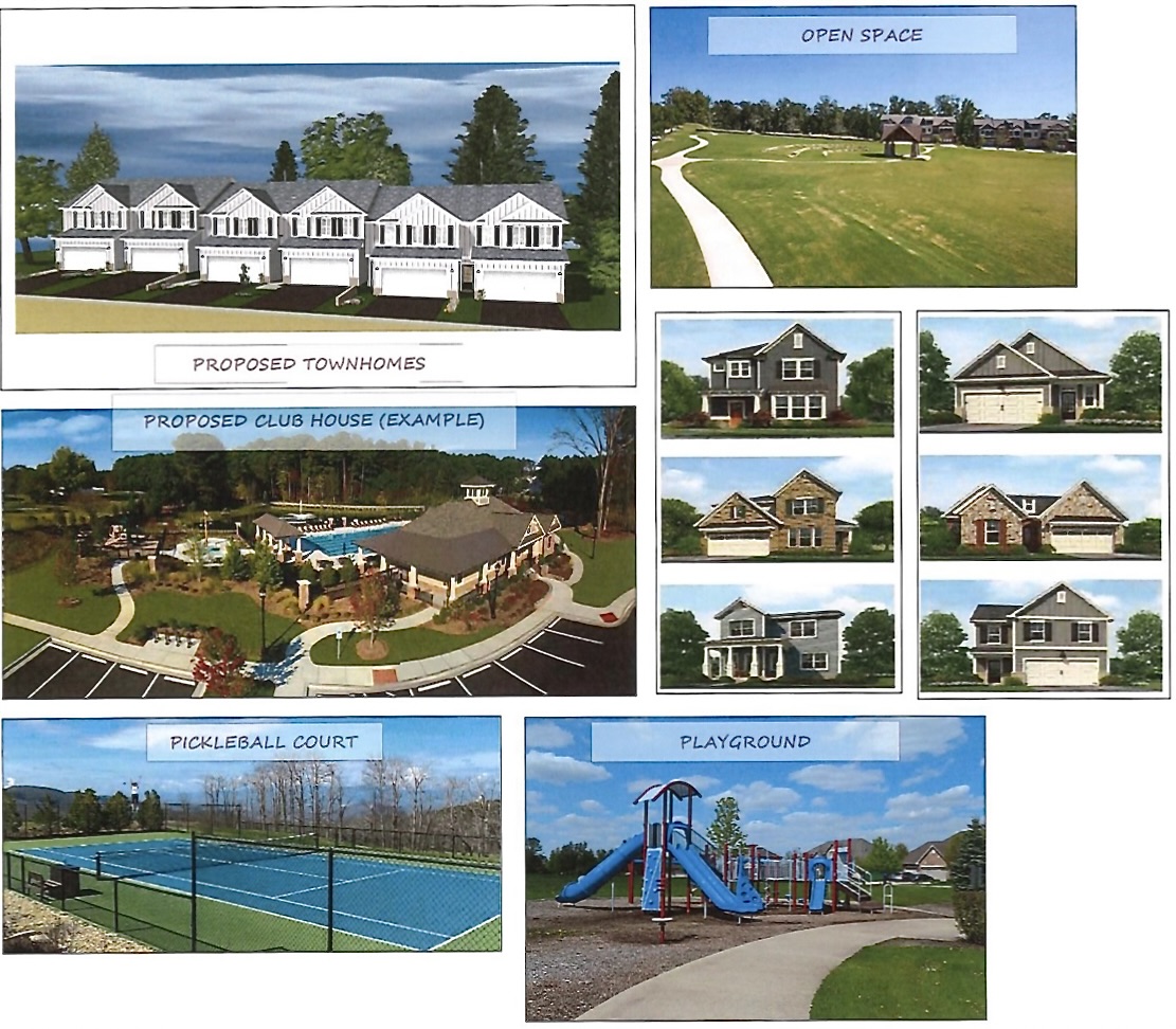 According to the submitted plans, the development would include a number of amenities, including a clubhouse, playground, and pickleball courts. It would also include approximately 30 acres of green space, 15 of which would be dedicated to the Town of Mt. Airy. While the proposed development diagram states that the development is 2.9 lots per acre, once the designated greenspace is subtracted, the actual development area could be as dense as 4.1 lots per acre.