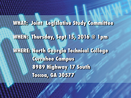 The Joint High-Speed Broadband Communications Access for All Georgians Study Committee will hold a public hearing on Thursday, September 15 at 1 p.m. at the North Georgia Technical College Currahee Campus in Toccoa.