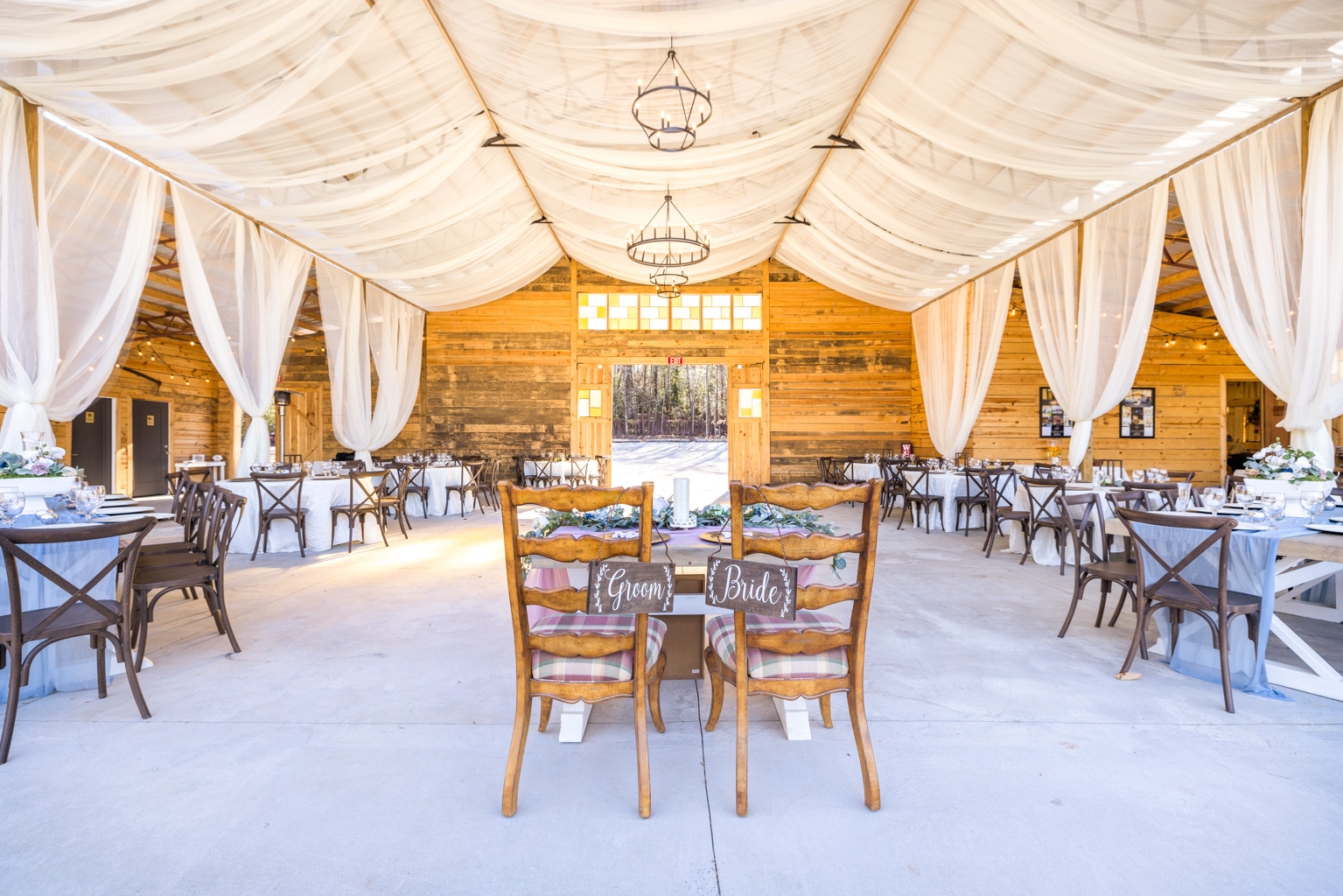 Step inside, and the rusticity collides with elegance. Exposed beams and paneled walls cradle stained glass windows, their colored panes scattering dappled light across handmade tables. A custom bar—its translucent panels inlaid with twisting branches—serves as a natural gathering point. Overhead, string lights crisscross the ceiling like constellations, and the polished concrete dance floor gleams beneath a delicate chandelier.