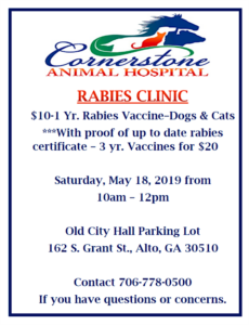 Cornerstone Animal Hospital will hold a rabies clinic in Alto on Saturday, May 18. The clinic will run from 10 a.m.-12 p.m. at the old Alto City Hall located at 162 South Grant Street.