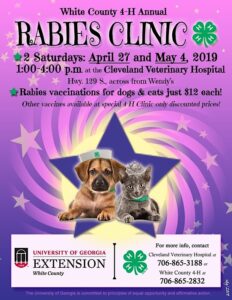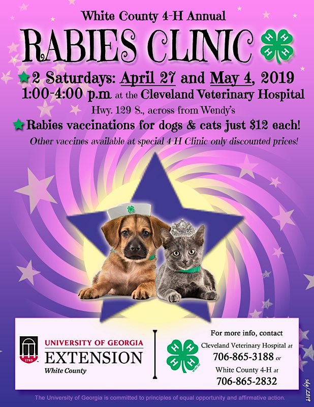 The White County 4-H Club will hold the second of its two annual rabies clinics this coming Saturday, May 4, from 1-4 p.m. at the Cleveland Veterinary Hospital located at 1029 S Main Street. At least 300 pets were vaccinated this past Saturday. Organizers expect more pets to be vaccinated this coming Saturday following a new report of rabies in the area.