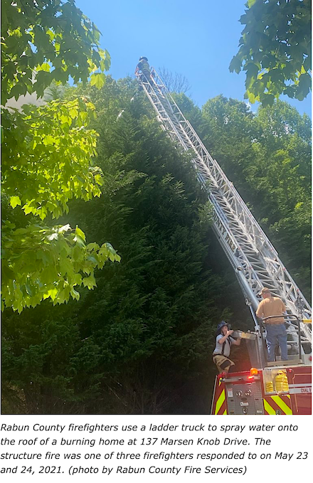Three-and-a-half hours later, around 8:25 p.m. Monday, Rabun firefighters and the Otto Fire Department were dispatched to a structure fire at 563 Shadow Mountain Drive in the Wynngate subdivision off Ledford Road in Dillard. They arrived to find a deck fire that the homeowner had mostly extinguished. “The fire appeared to have started below the deck with the cause being undetermined at this time,” says Upchurch. The main part of the house did not sustain any damage.