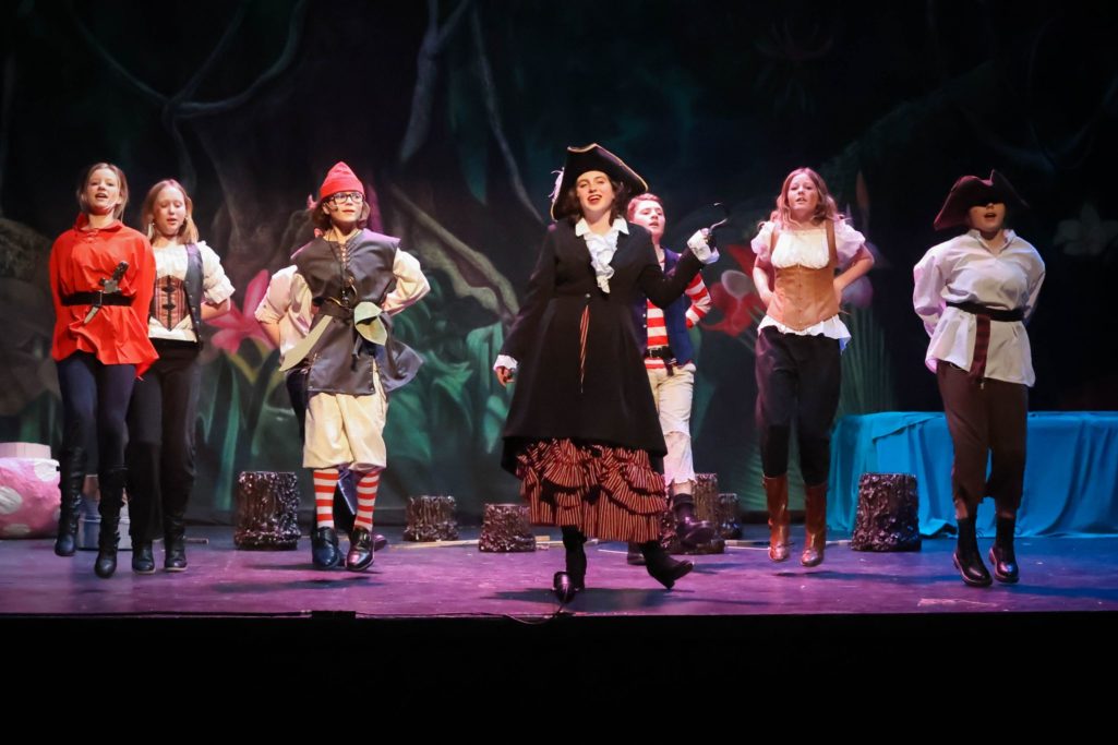 Characters in “Peter Pan Jr.” fly through Neverland during Rabun Gap’s Middle School production of “Peter Pan Jr.” Pictured from left, are Abby Hartridge of Clayton, GA as Peter Pan on trapeze, Makenna Bilbery of Otto, NC as Wendy on silks, and Andrew Tench of Clarkesville, GA, Porter Mulholland of Franklin, NC as John and Micheal on lyra. (photo courtesy Rabun Gap Nacoochee School)Hannah Demmler of Rabun Gap, center, as Captain Hook, sings on stage with Allen Arbitter of Clayton as Smee, second from left, and pirates portrayed by Tess Purtle of Greenville, SC, Zoe Walters of Rabun Gap, Mont Wood of Clarkesville, Andrew Lancaster of Cherokee, NC, Carson Hill of Clarkesville, and Owen Murphy of Franklin, NC. (photo courtesy Rabun Gap Nacoochee School)