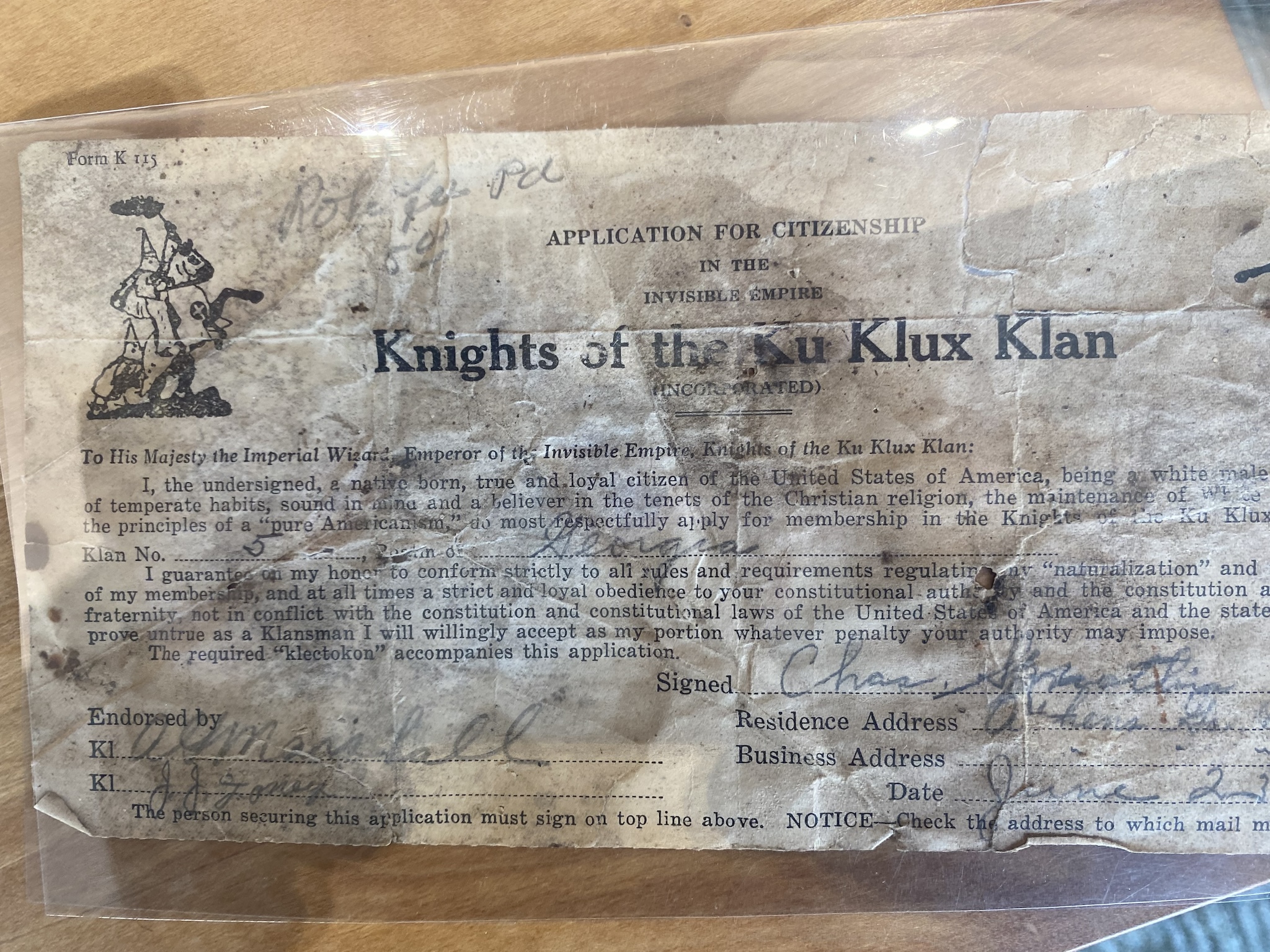 I, the undersigned, a native born, true and loyal citizen of the United States of America, being a white male Gentile person of temperate habits, sound in mind and a believer in the tenets of the Christian religion, the maintenance of White Supremacy and the principles of a “pure Americanism,” do most respectfully apply for membership in the Knights of the Ku Klux Klan through Klan No. (5) (illegible here) …Georgia.
