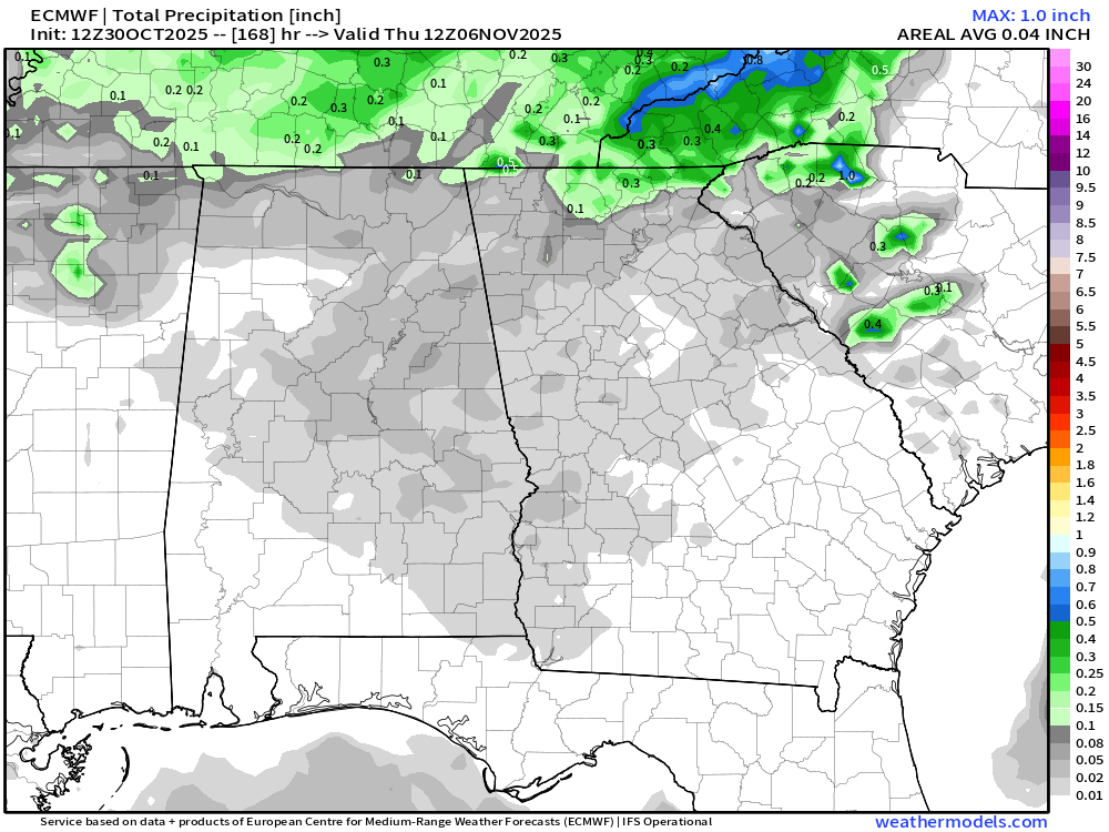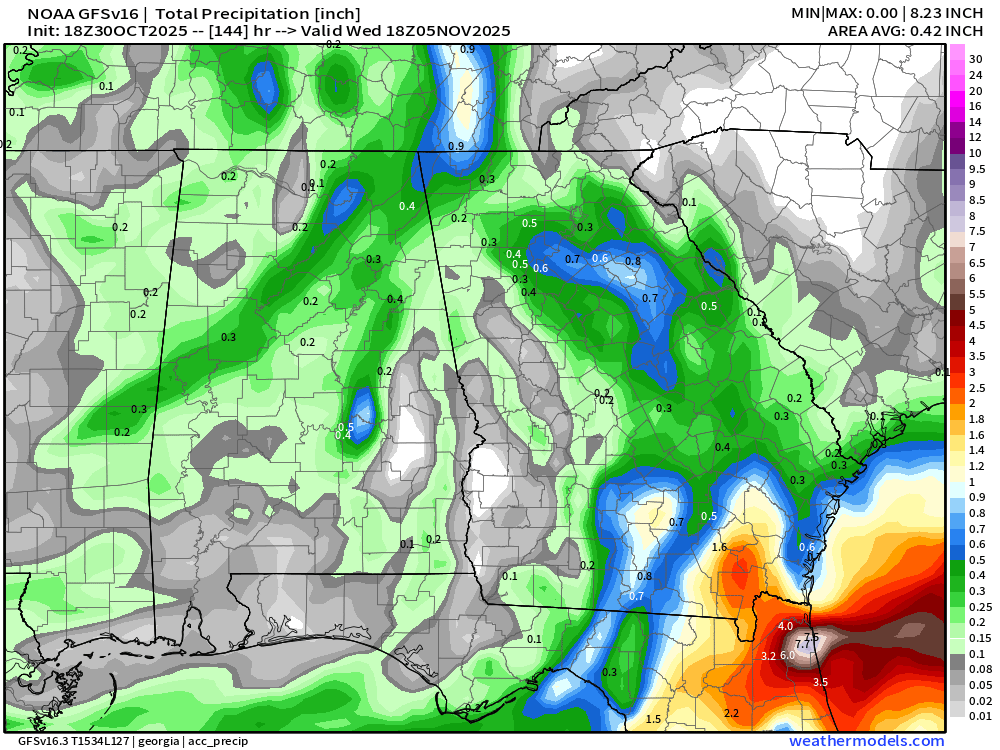 Compared to last week, the total area of the state currently under drought conditions dropped from 97% to 91%. Most of the improvement came over Northeast Georgia where as much as 4″ of rain fell over the past week. Most of this area was just in a D0, or abnormally dry, condition which made drought erasure much easier. Further south towards the Atlanta Metro a D2, severe, and D3, extreme, drought area continues to persist. Fayette and surrounding counties are currently the hardest hit in the northern part of the state. These counties remain in an extreme drought. Analysis from the NWS does show that this arear received a decent amount of rain, around 2-3″, but not enough to erase the drought. Further south towards Columbus rainfall totals were much lighter, and the extreme drought areas of south Georgia have barely received any at all.