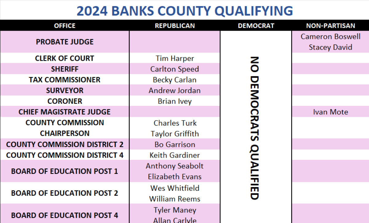 Banks County will have 13 races during the May Primary. Eight of those races are uncontested. The Chairman’s seat on the County Commission is contested, along with the Probate Judge and three seats on the Board of Education.
