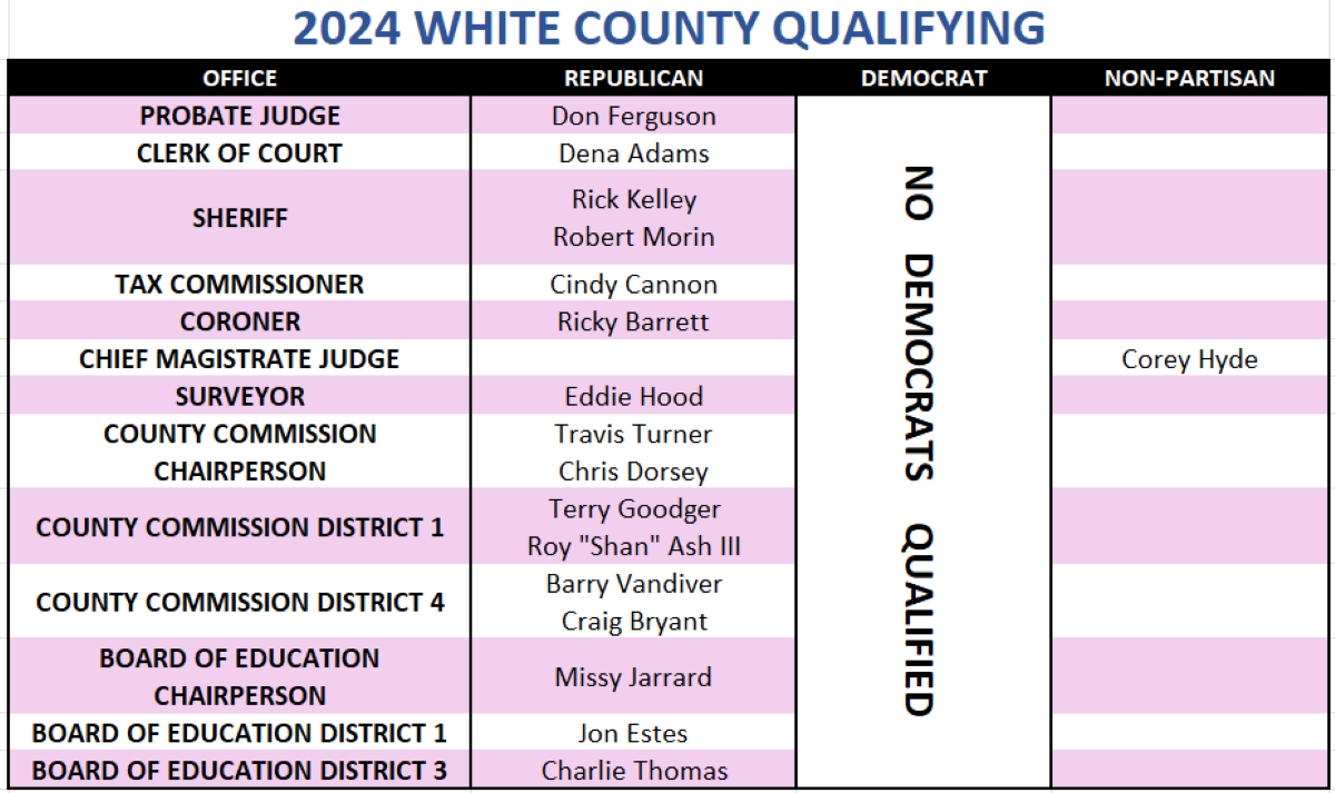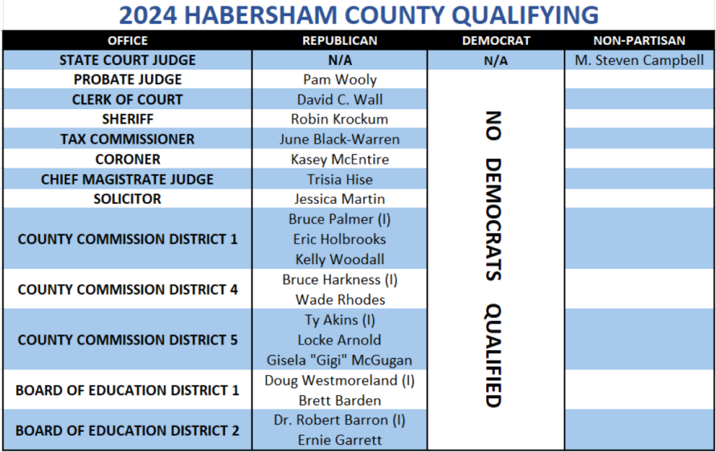 The story has been updated to include the Habersham County qualifiers and White County Sheriff candidate Robert Morin.