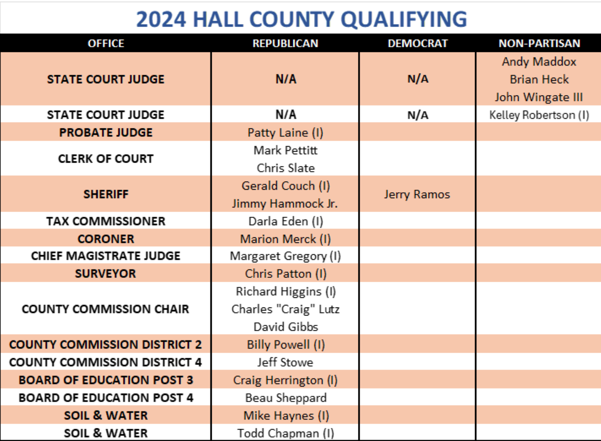 Hall County has 16 races going into the May Primary with only four of those races being contested. The four contested races are for Sheriff, County Commission Chair, a State Court Judge seat, and the Clerk of Court. The County Commission Chair and State Court Judge seats have the potential to end in a run-off.