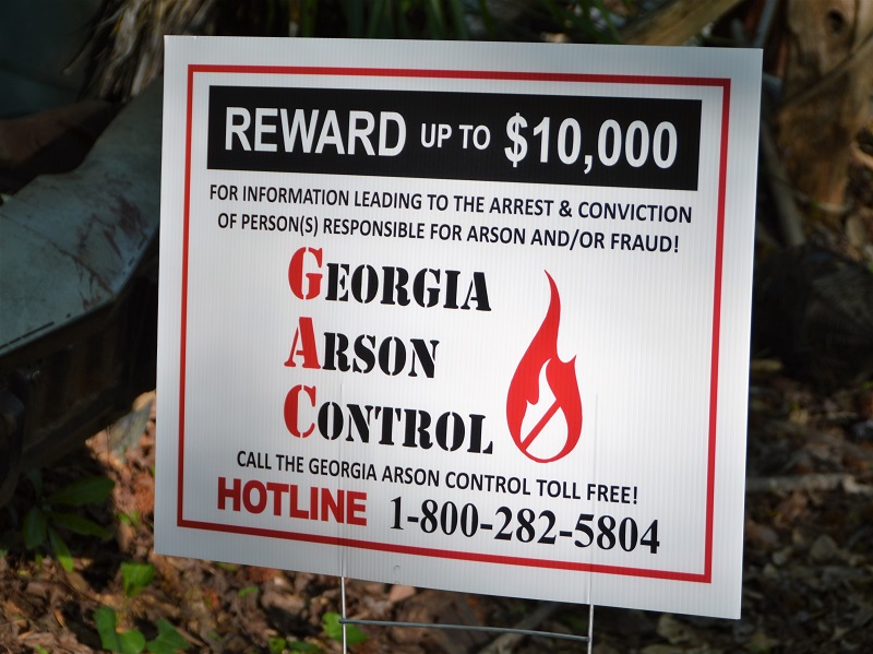 The Georgia Arson Control Board offers a reward of up to $10,000 for information leading to the arrest and conviction of a person or persons responsible for arson and/or fraud.