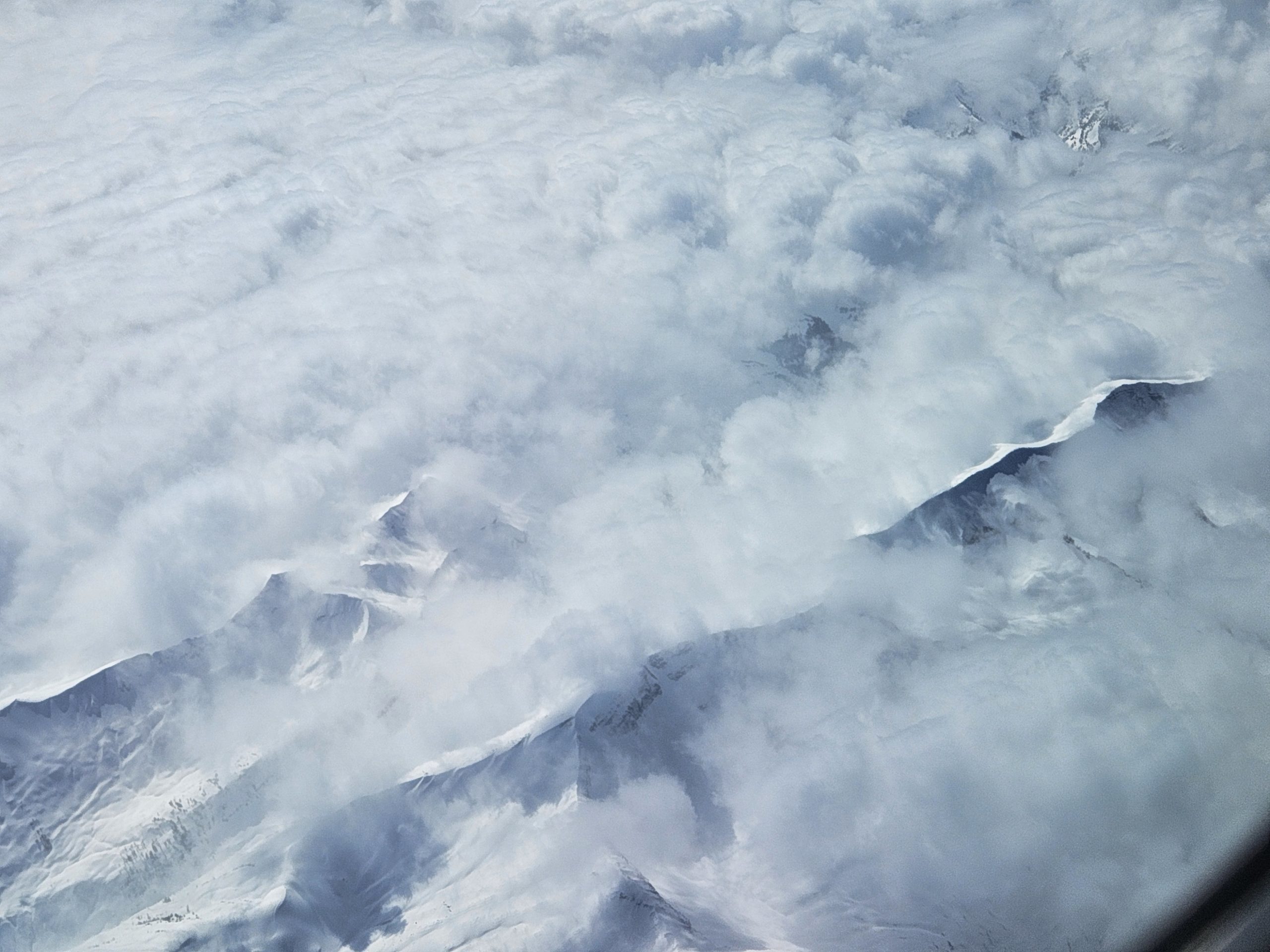 I got my favorite image from the air during the return trip over the Rockies when the weather improved. It features some of the tall peaks sneaking through some low clouds/fog that had settled that morning.