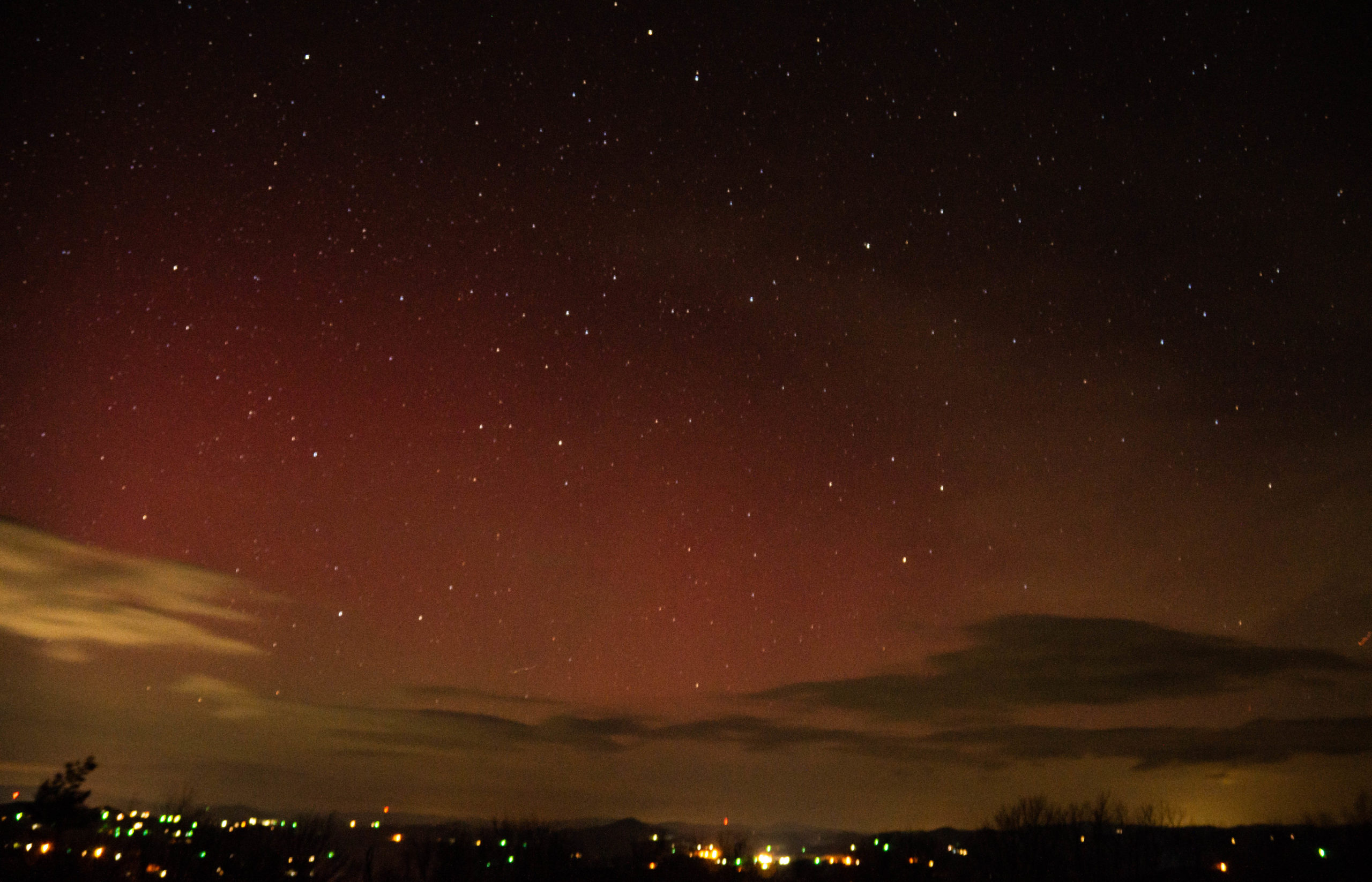 Over the next hour, I would see this glow come and go; occasionally, brighter pillars would appear, as seen above. During both my previous views, I saw more of a purple, and even white, color to them, but this time it was most certainly deep red.