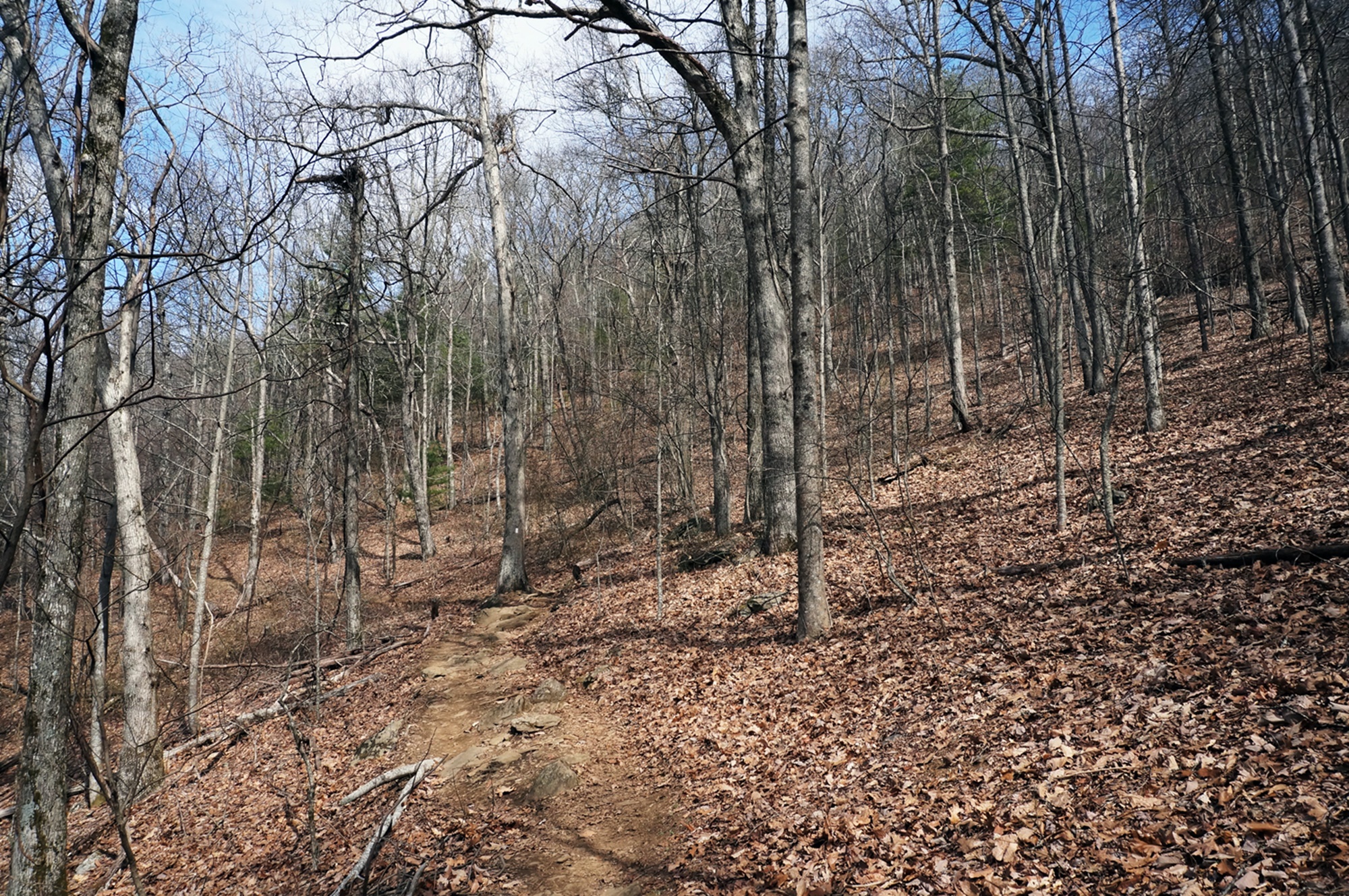 For the first 3/4 miles, the trail is relatively flat and easy going. It winds through numerous hollows that were carved out by ancient streams and runoff.