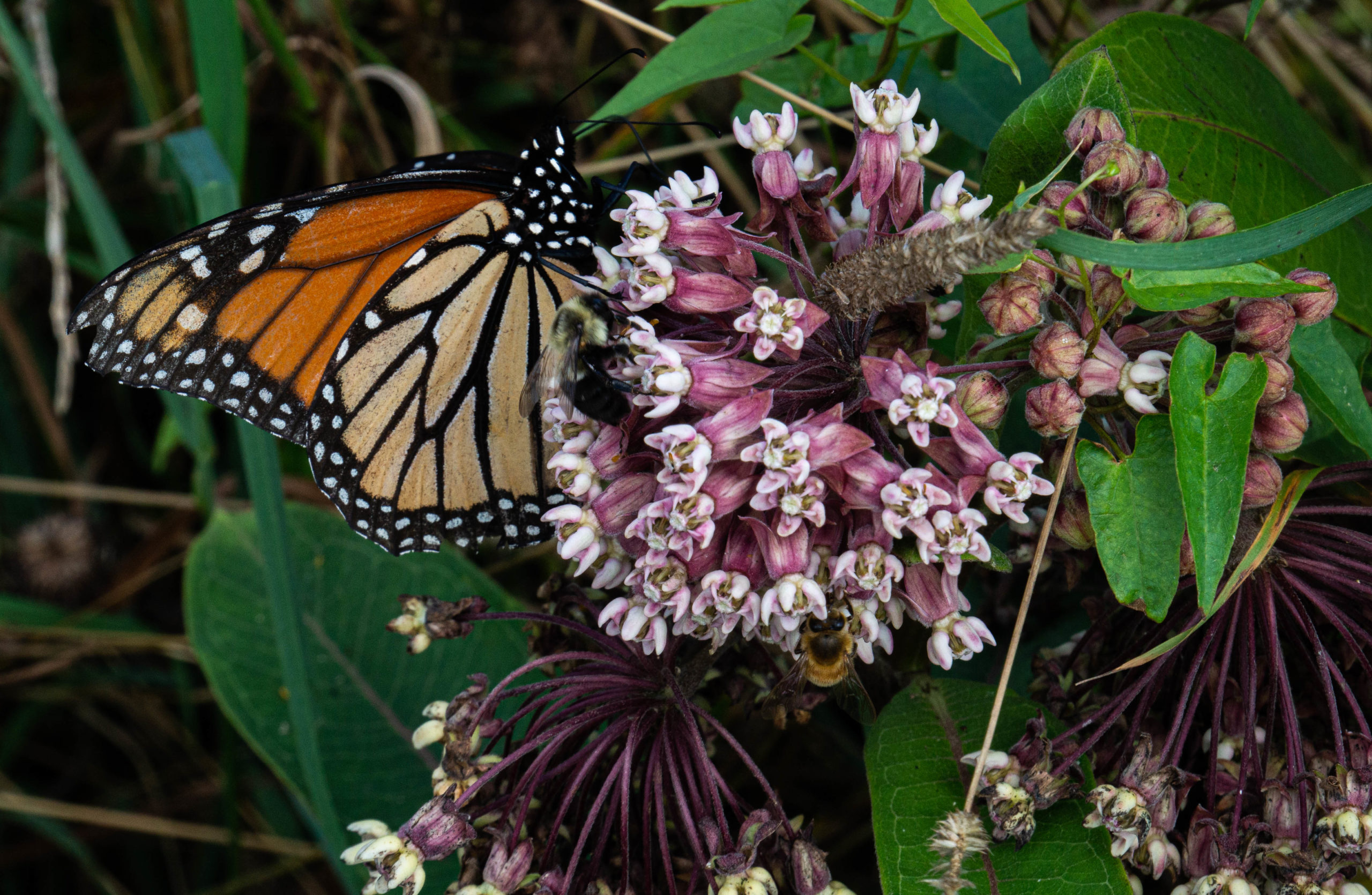 They can be found through much of the summer, but especially during the months of May and October as they migrate north for the summer and south for the winter. As I mentioned, they are most commonly found on milkweed plants, easily identifiable as large pink/purple balls of flowers on tall stems. These plants are most common in open areas with plenty of sun. They may even be seen sharing them with local bees, which also love these plants for their nectar.