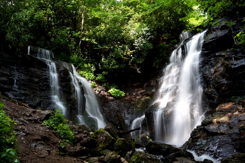 Double falls are exceedingly rare and beautiful. Located just outside Cherokee, NC lies a relatively unknown waterfall called Soco. It is located just off Highway 19 between Cherokee and Maggie Valley. At this falls, two separate creeks join via a 40-foot drop. The only downside to these falls is the trail is very poorly maintained and quite slick. A viewing platform is located a short walk from the small parking area, and those more adventurous can use the rope to climb down to the base of the falls (where these photos were taken). I don’t recommend this part of the hike for small children as it is somewhat dangerous and difficult.