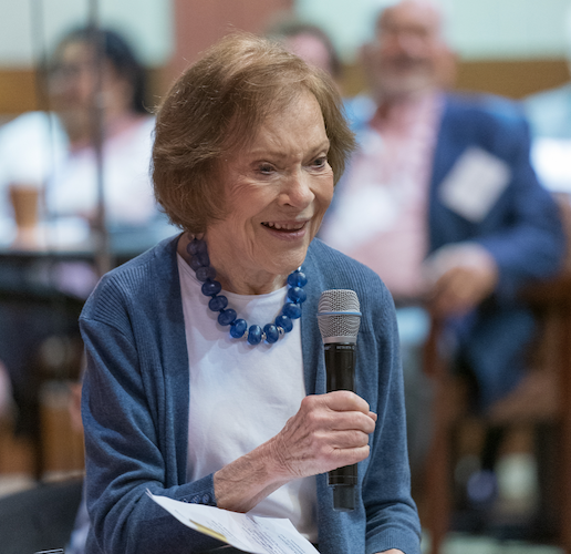Last Saturday, at an event held in honor of the former first lady’s birthday, Rosalynn and Jimmy Carter made one of their first public outings in awhile for the dedication of a new butterfly sculpture that’s part of the trail and is on property next door to where she grew up. The former first lady, using a walker, flipped a switch to illuminate the artwork at nightfall.