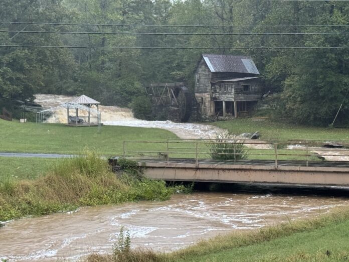 The swollen creek at Loudermilk Mill off GA 197 South in Mt. Airy flooded adjacent property early Friday morning, Sept. 27, 2024. (Joy Purcell/NowHabersham.com)