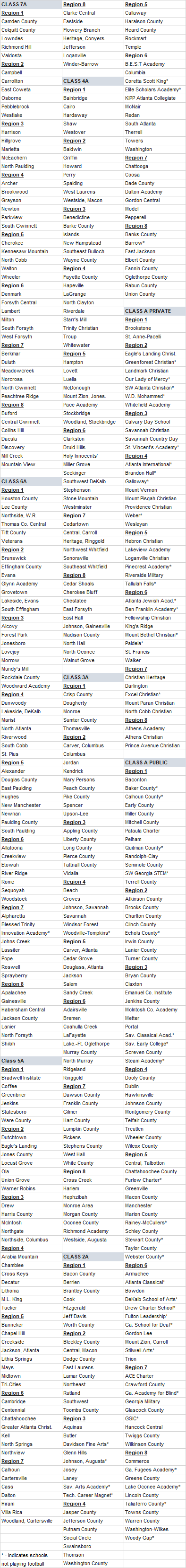 DeKalb County private schools St. Pius and Marist are up in Region 4-6A with northern crescent metro Atlanta schools Dunwoody, Riverwood and South Cobb. Woodward Academy is up in Class 6A with Clayton County-dominated Region 3.