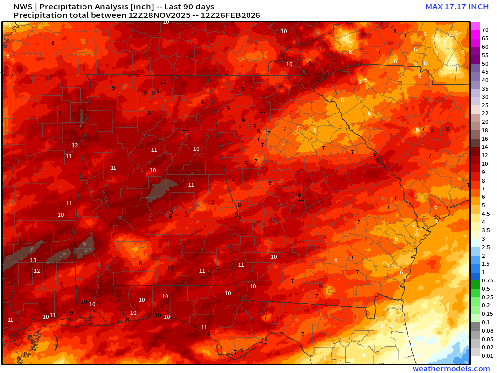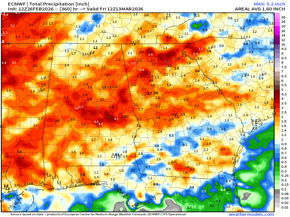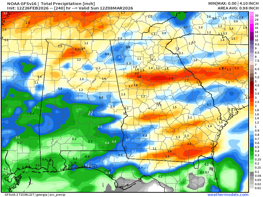 Unfortunately, the upcoming weather pattern is not promising for any significant rainfall. The current system is expected to bring a widespread 1-2″ of rain across the central and southern parts of the state, but beyond that it does appear we will stay mainly dry with a significantly warmer airmass moving in. The Euro 15-day forecast and the GFS 10-day forecast are both below, but keep in mind these also include the current weather system. The Euro solution is much more optimistic for rain across North Georgia, while the GFS is more optimistic for South Georgia.