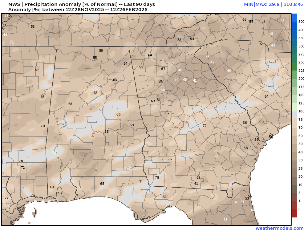 Rainfall deficits remain very concerning. The 3 month percentage of normal and departure from normal can be seen below. Deficits range from just 3.3″ in Albany to over 7.1″ in Atlanta and 8.0″ in Athens. These deficits have resulted in very dry soil which has led to many increased fire danger days across the entire state.