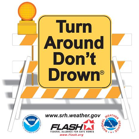 - Avoid areas already flooding, especially if the water is fast flowing. Do not attempt to cross flowing streams. Road beds may be washed out due to the flooding. Never try to cross flooded roadways. Remember, turn around, don’t drown.