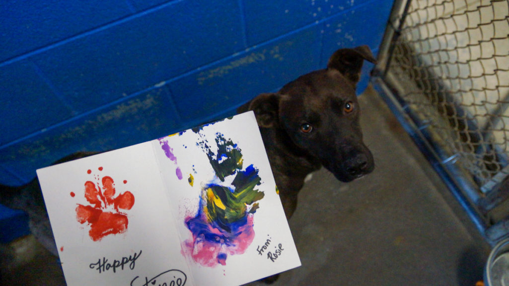 The shelter staff and shelter dogs got together to make something special for their community: valentines. HCACC’s Olivia Whitfield set the dogs up with paint, peanut butter and pawprints to paint their own masterpieces to share with the community.
