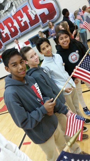 Students greeted veterans with flags and smiles during the school’s annual Veterans Day celebration on Nov. 10, 2014. (photo by Melinda Wallace)
