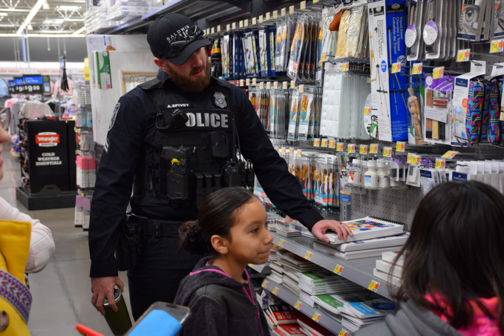 The Baldwin Fire and Police Departments sponsor “Shop with a Hero” each year to bring Christmas to families. Monday morning, 12 students from Baldwin Elementary School, accompanied by their families and volunteers, were able to buy Christmas gifts that they would not have been able to this year because of financial challenges.