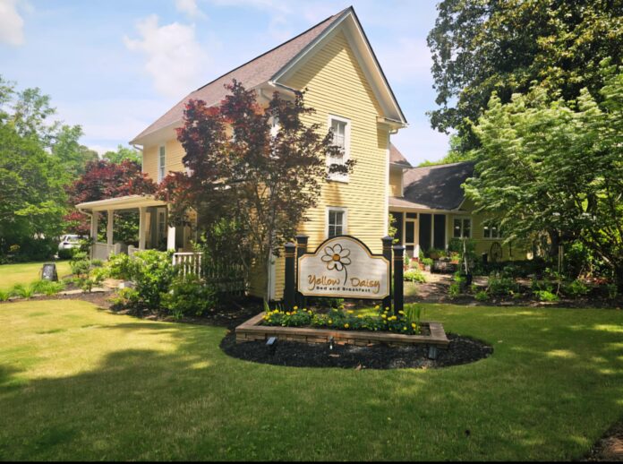 The Yellow Daisy Bed & Breakfast sits with the quiet confidence of a genteel matron. Its buttercream paint and crisp white trim echo the cheerful sweetness of its name. The Edwardian farmhouse greets visitors with a deep wraparound porch draped in potted plants and American flags. Rocking chairs and wicker seating invite guests to stay awhile and bring a book. The landscaping is deliberate but never showy—beds of flowers and neatly trimmed hedges soften the walkway, while mature maples provide shade and color.