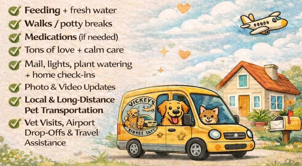 Vickey’s VIP Pet Taxi and Pet Sitting offers a full line of services, whether you are on vacation or moving.