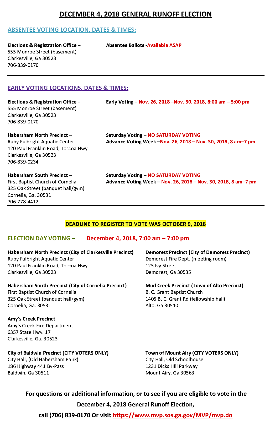Absentee ballots will be available soon, according to the Habersham County Elections Office. Early voting is Nov. 26-30. Polls will be open weekdays at the Habersham County Elections Office in Clarkesville from 8 a.m.-5 p.m. and at the Ruby Fulbright Aquatic Center and First Baptist Church of Cornelia from 8 a.m.-7 p.m.