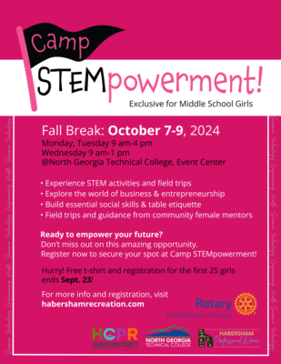 Designed as a day camp, Camp STEMpowerment is a dynamic new camp to inspire and empower young women in the fields of Science, Technology, Engineering, and Mathematics (STEM). Sponsored by The Habersham County Rotary Club, in partnership with North Georgia Technical College, Habersham Professional Women, and Habersham Parks and Recreation, the camp will take place from October 7-9, 2024, at North Georgia Technical College.