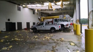 While utility crews worked into the night to restore power, HEMC was left to deal with damage of its own. Dover says, “The roof of the warehouse and truck shed at the HEMC headquarters in Clarkesville did sustain wind damage. Some small trees on the campus were also damaged.”