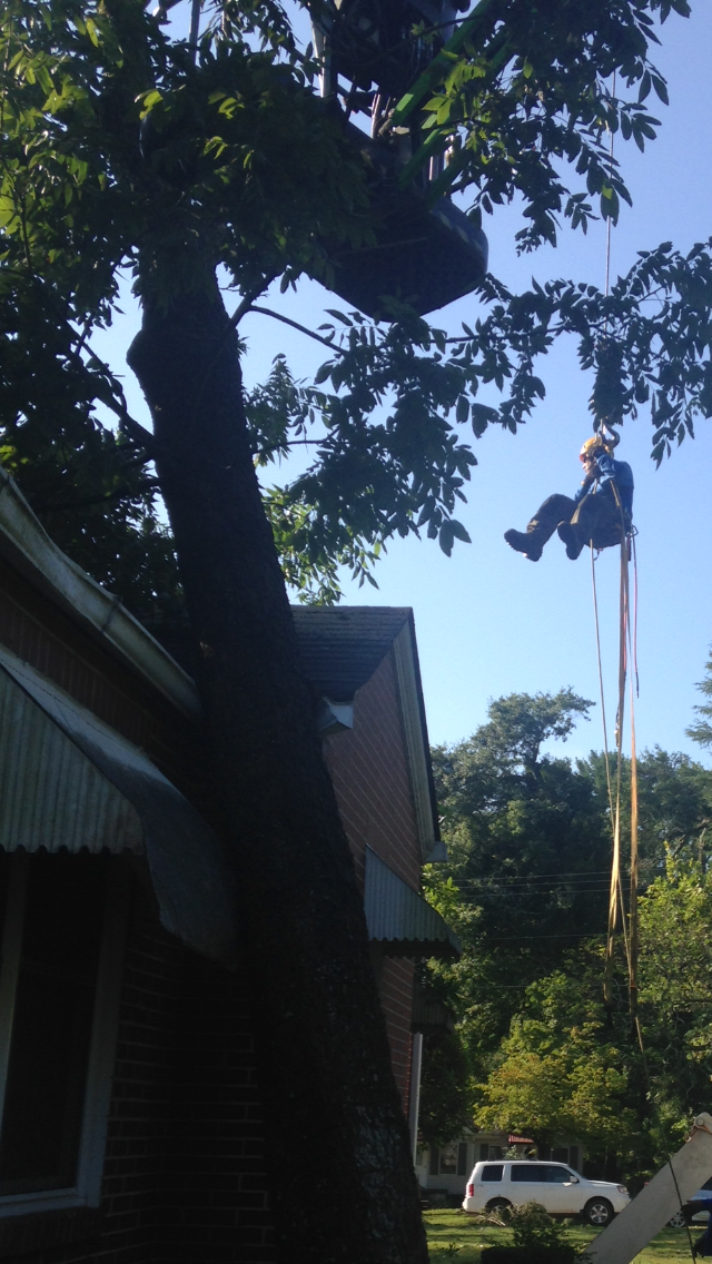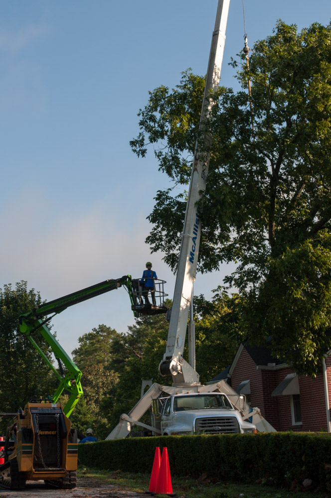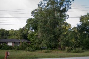The Habersham 911 center confirmed that no calls concerning injuries were made, nor requests for EMT’s received. However, several homes were damaged. Phyllis Head, who owns a home at the corner of Grant and Brightwell Street, had a large tree pushed over against her home causing damage to the roof, and possibly the brick siding. McAllister Tree Service was on-hand with a massive crane sawing and lifting the fallen tree off Head’s home. Don McAllister, who was helping with removal of the tree said the owner was lucky. “We’ve been busy all morning. Most trees were in the roadways, but a few landed on homes. It could have been much worse,” McAllister pointed out.